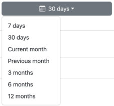 The date period selector is set-up to give you quick access to important time periods and covers the following time periods. Last 7 days, Last 30 days, Current Month, Previous Month, Last 3 Months, Last 6 Months and Last 12 Months.