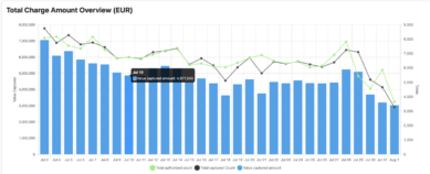 This graph has two y axis and shows you the total authorized count, the total captured count and the Total Value captured within the time period selected. It’s fantastic at giving you a clear view of what’s happened and helps you quickly identify trends and anomalies.
