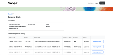 Payment Activity – Date & time, Action, Resource ID, Merchant name, Amount, Result